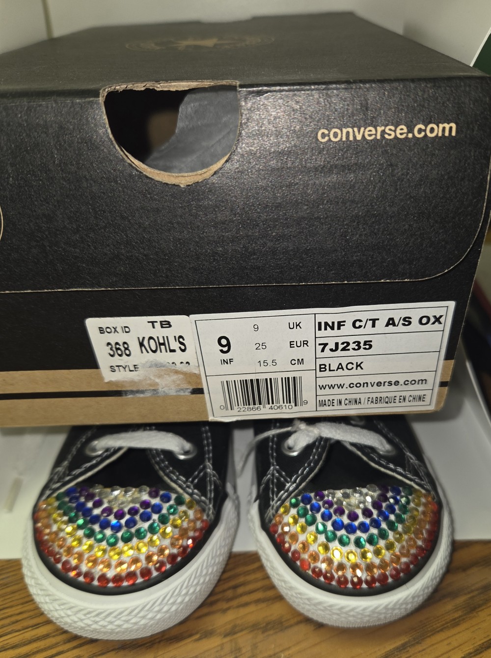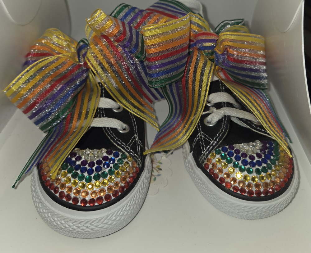 Size 9 INF Black Converse - NEW with boxRainbow crystals on toe area (hand placed)Rainbow ribbons (on alligator clips).