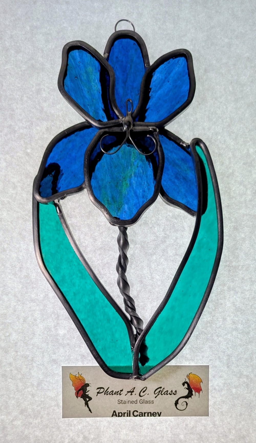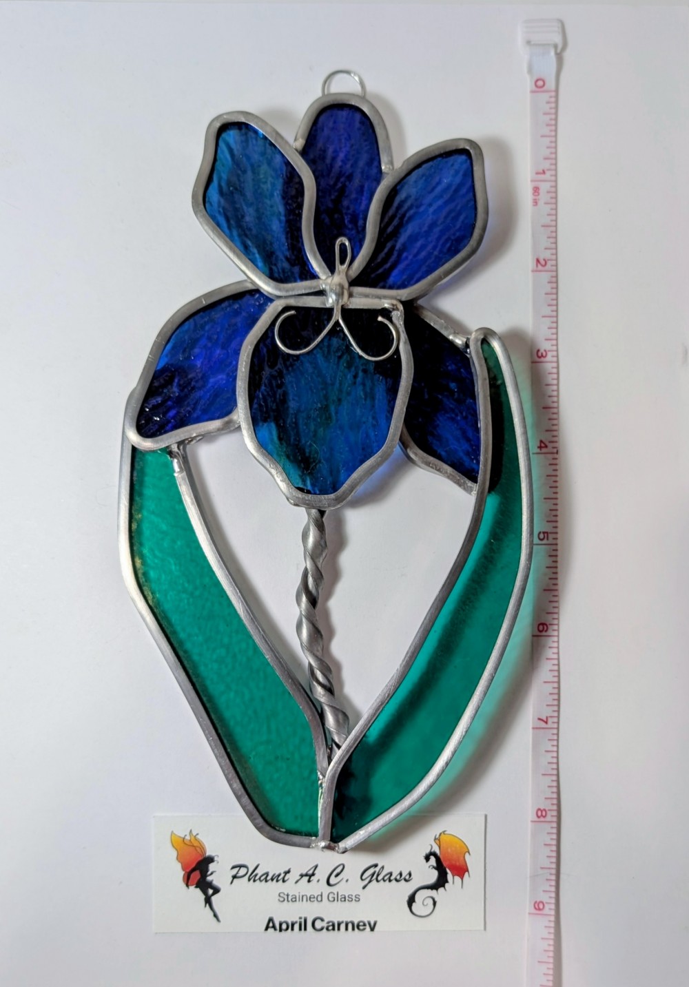 Handcrafted leaded stained glass iris suncatcher featuring six petals and two long flowing leaves. The twisted stem detail adds texture and movement, while the layered design gives the flower depth and dimension. Each piece is individually cut, shaped, and soldered, making every iris one of a kind.