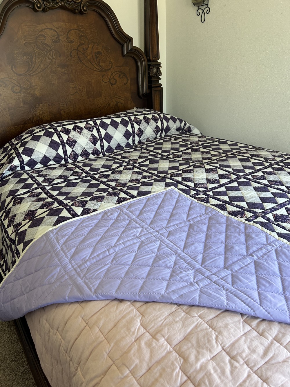 Gorgeous purple, diamond patchwork done with different purples, light and dark with white, small squares and borders in dark purple. Queen size a beautiful addition to any room reverse side is a light purple. Hand stitched machine bound. Thank you for looking!
