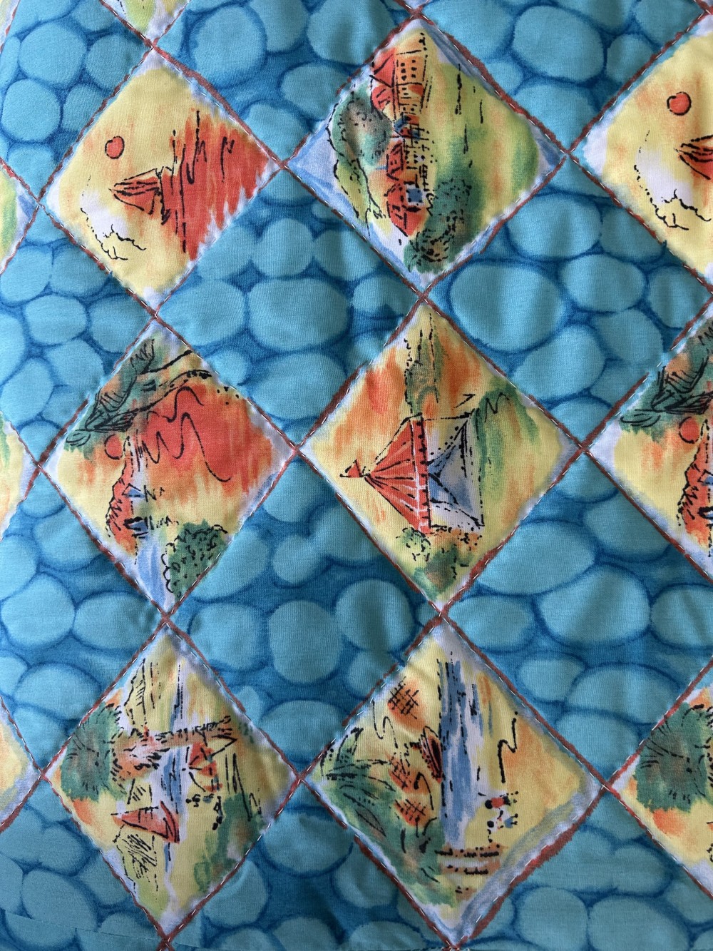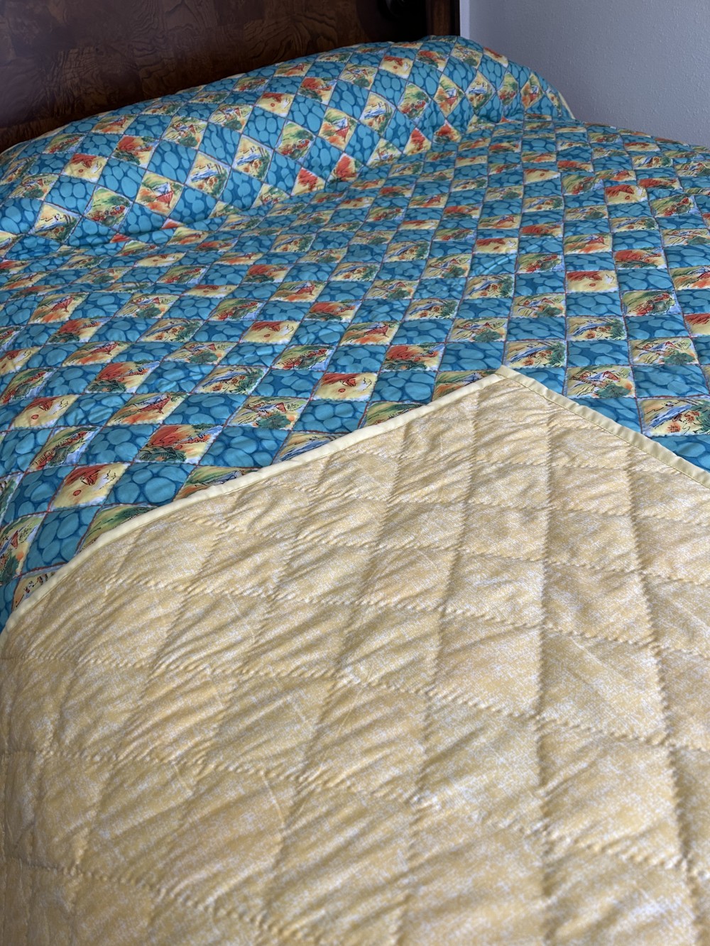 Turquoise Squares with Yellow Beach Scenes, Hand Stitched, Yellow Reverse Side. 94”L x 82”W Lg Queen