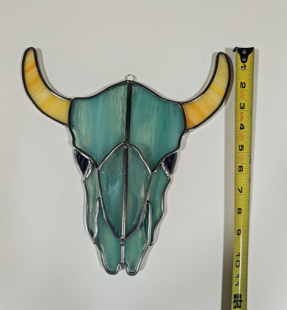 Bring a touch of the Great Plains into your home with this handcrafted stained glass skull. This piece features a vibrant teal-marbled body contrasted by warm, sun-yellow horns, capturing a modern Western vibe. Each piece is wrapped with lead cane and layered which makes the colors pop. Whether you’re a fan of boho decor or looking for a statement piece for your home wall, this sun catcher adds a bold, artistic touch to any space.