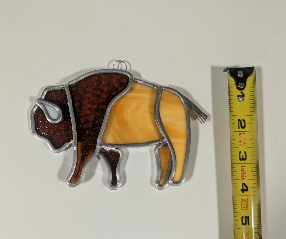 4 in by 5 in. Layered leaded stained glass Buffalo suncatcher glass colors are creamy white streaky with brown cream mix white horn. Handmade