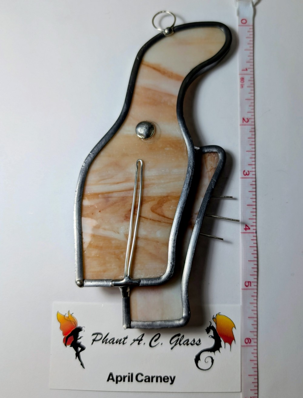 This handmade stained glass cat suncatcher measures approximately 6 inches tall and is created using the traditional lead cane technique. The cat has two sides as cat lovers. We all know the cat likes to show us its backside the best .Warm orange, cream, and soft peach tones blend together, giving the glass a gentle marbled look when light shines through.